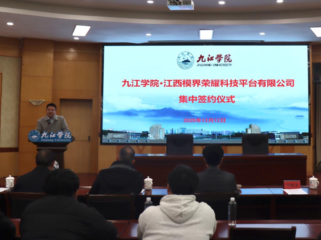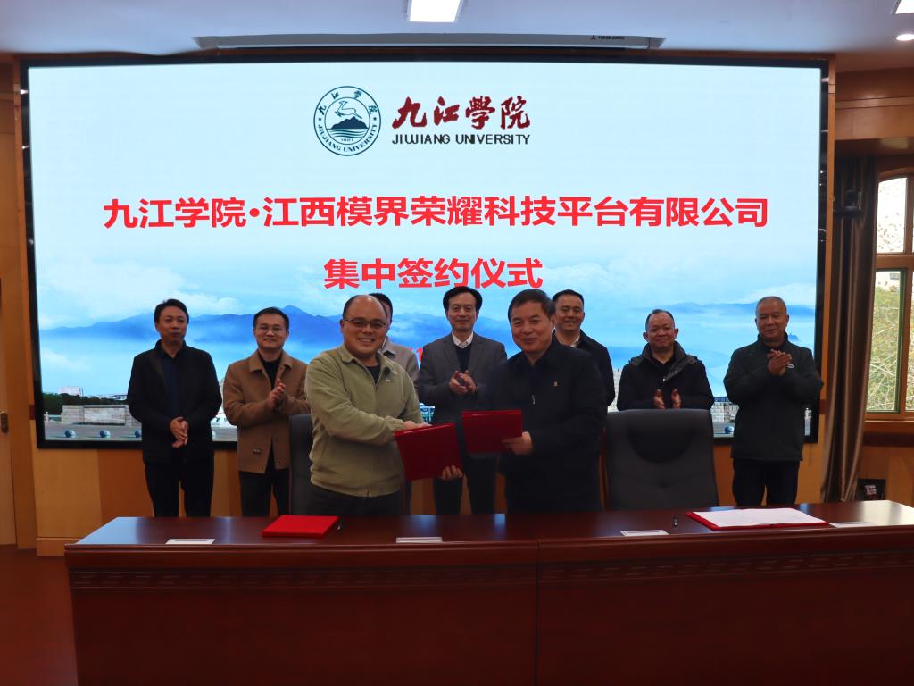 为深入贯彻省委“三大高地、五大战略”和九江市“三大攻坚行动”部署要求,落实学校“3353战略”与“十百千”社会服务体系建设,12月12日上午,九江学院与江西模界荣耀科技平台有限公司集中签约仪式在学校行政楼四号会议室举行。九江学院党委委员、副校长吴维勇出席签约仪式,江西模界荣耀科技平台有限公司总裁刘晓龙、总经理吴志成,修水县产业服务中心主任周正根,学校科研处、发规处、机械与智能制造学院、材料科学与工程学院、计算机与大数据学院、电子工程学院负责人及师生代表参加活动。